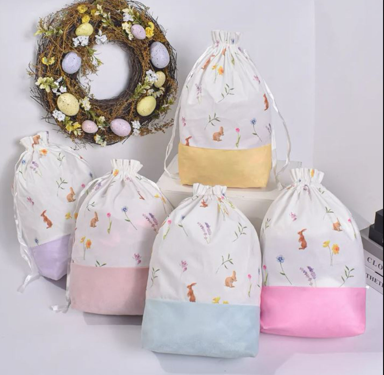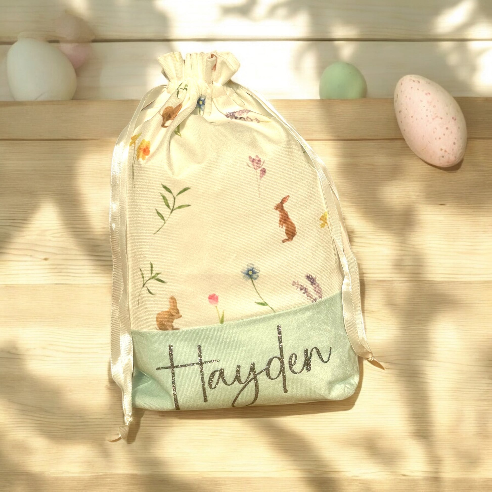 These cute personalised Easter Bunny Bags features a super cute bunny and floral print with a coloured bottom section – available in Yellow, Blue, Hot Pink,Dusty Pink & Purple. It's perfect for a magical Easter egg hunt or to fill up with delicious chocolate and goodies and give as a gift. This personalised bag features a large purple bunny with a fluffy white tail. Create a great Easter gift with a personalised easter bunny bag.